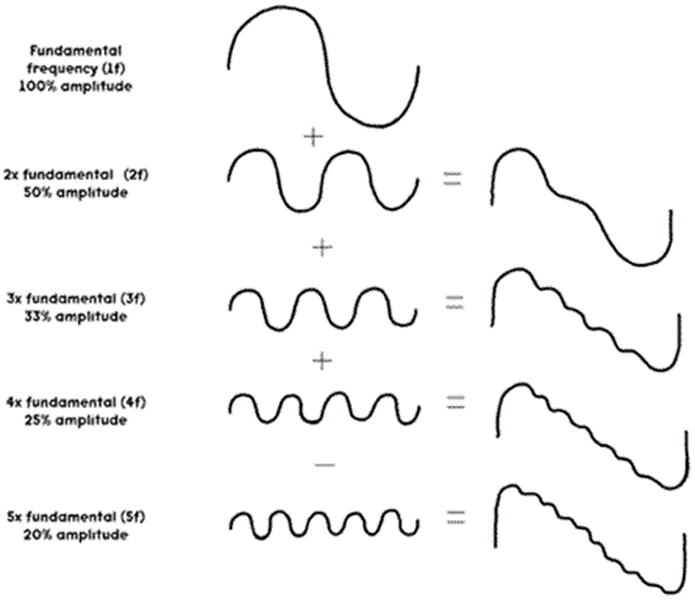 当然,光是写出这一个方程还不够,还需要确定声音之间相互作用的方式。我们已经知道,任何一个声音都是由一系列频率的波叠加而成的,而其中振幅最大的那个波的频率,也就是这个声音的基频。在音乐理论中,“基频”就是“音高”。而由于组成每个声音的一系列波的振幅,相位等各不相同,所以即使用不同的乐器演奏音高相同的音时,给人的听感往往也大不相同,这就是我们说的“音色不同”。在本文中Jesse使用的就是锯齿音色,也就是“泛音”,这类音色一般可以在弦乐器中找到。