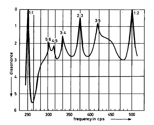 从图中我们可以看到在一个八度内协和度最高的就是我们最开始提到的1:1与1:2的比例关系,也就是两个250Hz的音,或者一个250Hz和一个500Hz的音。协和度排第二的是当两个音频率之比为2:3的时候,也就是250Hz与375Hz,这个比例也很重要,与后文要提到的五度相生律有重要关系。