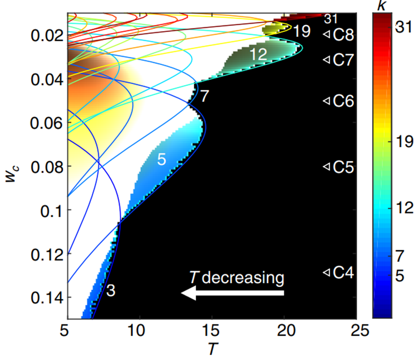 因为上一次我们做的平均场近似固定了,但是从图2-1 可知在不同高低的八度区间内是不一样的。所以,如果使用正确的会得到怎样的结果呢?如图2-5所示,横坐标为温度,从右到左不断降低以描绘所述的降温过程。左边的彩色矩形显示了不同颜色对应的k值,左边的纵坐标为值,对应右边从C4到C8共4个八度范围。