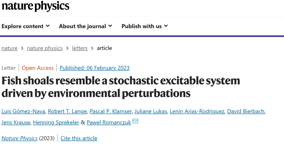 论文题目:Fish shoals resemble a stochastic excitable system driven by environmental perturbations 论文来源:Nature Physics 论文链接:https://www.nature.com/articles/s41567-022-01916-1