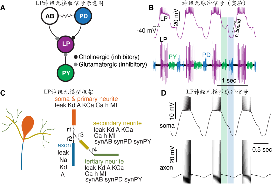 由于神经元及环路特性相对简单且刻画完整,该研究选取了螃蟹胃部神经系统中的lateral pyloric(LP)神经元作为研究对象。LP神经元在发育过程中,每个神经元中各种离子通道表达水平存在很大的个体差异性,且成熟后的离子通道凋亡、合成和嵌入等活动,都会引入固有噪声。此外,环路中的其他抑制性神经元也会因突触强度随机性,引入输入信号噪声。