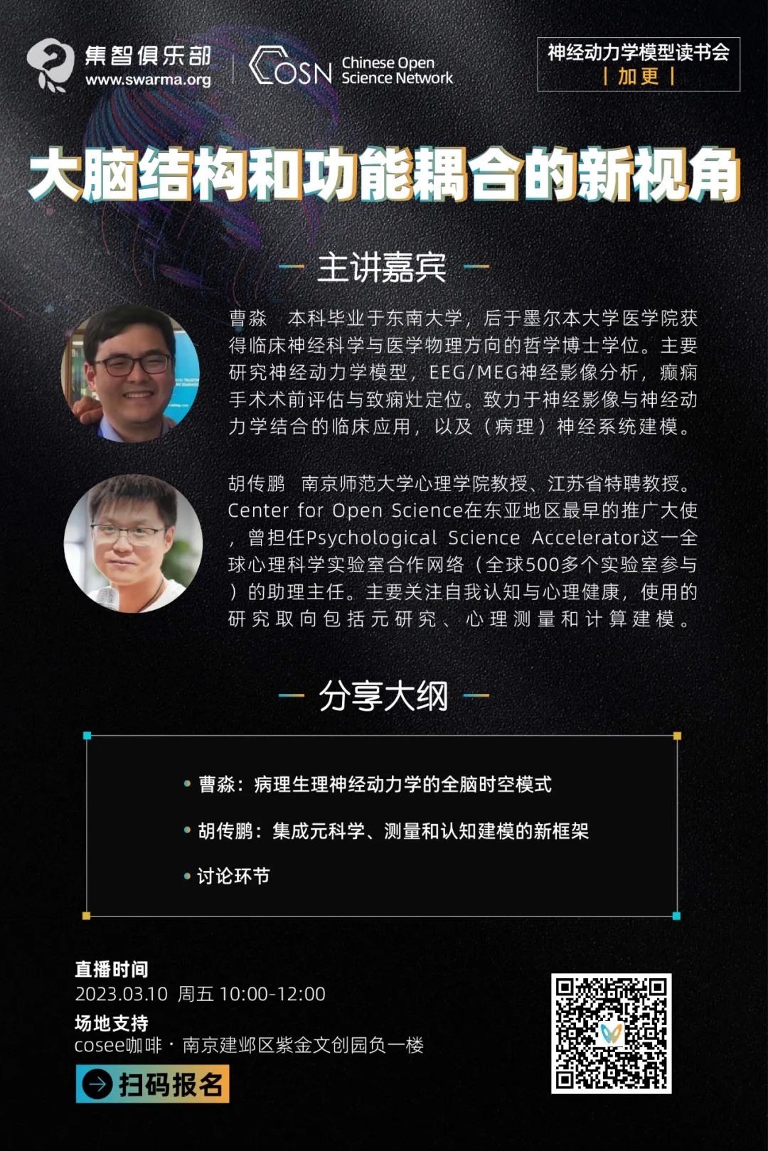 基于对“大脑的结构与功能耦合”话题的共同兴趣,我们邀请了北京大学的曹淼老师、南京师范大学的胡传鹏老师分别基于最新的研究进行主题分享,并邀请南京信息工程大学李春彪老师作为讨论嘉宾参与交流与探讨。此次分享活动,面向神经动力学模型读书会成员开放,由集智俱乐部和开放科学中文社区(OpenScience公众号)共同举办,并在集智俱乐部官方平台同步直播,感兴趣的朋友可以预约本次直播,南京的集智读书会成员可报名线下参与。