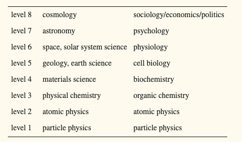 结构与因果的层级。表中给出了自然(左)及人文(右)在现实中的层级简化版本(根据相应的学科特征)。从因果角度,较低层级是较高层级的基础。在化学层级之上的层级中,左列及右列没有相关性,因为自然与人文的涌现和因果是截然不同的;但是它们的前四个层级是相同的(生命是物理现象的涌现!)。可以访问http://www.mth.uct.ac.za/∼ellis/cos0.html了解更多细节。