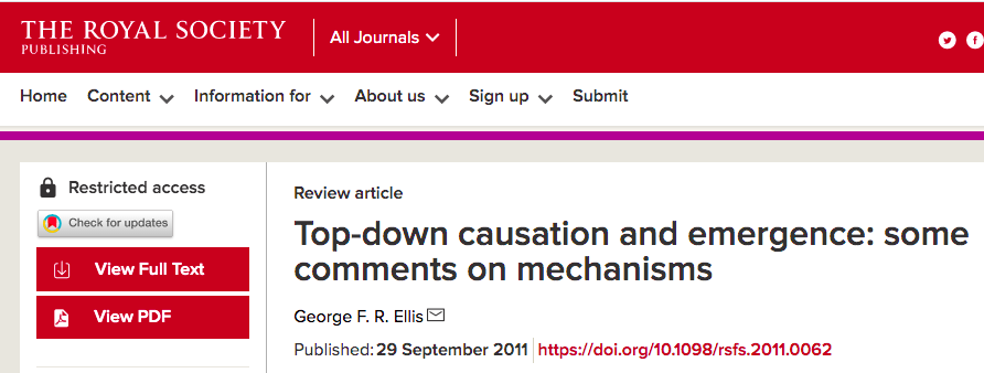 Auletta G., Ellis G. F. R., Jaeger L. 2008. Top-down causation by information control: from a philosophical problem to a scientific research program. J. R. Soc. Interface 5, 1159–1172 10.1098/rsif.2008.0018 (doi:10.1098/rsif.2008.0018)