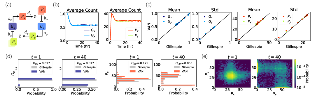 图2:基因切换开关的结果。(a) 随机反应网络的示意图。(b)由VAN(点)和Gillespie算法(线)得到的基因和蛋白质的平均分子数随时间的演化。(c)比较VAN和Gillespie模拟在时间点t = 0,1,…,40的基因和蛋白质的均值和标准差。(d)Gillespie模拟(灰色)和VAN的边缘分布。图例中包含两个分布之间的Hellinger距离。(e)由VAN得到的两种蛋白质在时间点t = 1,40的联合分布,颜色对应对数尺度上的概率值。