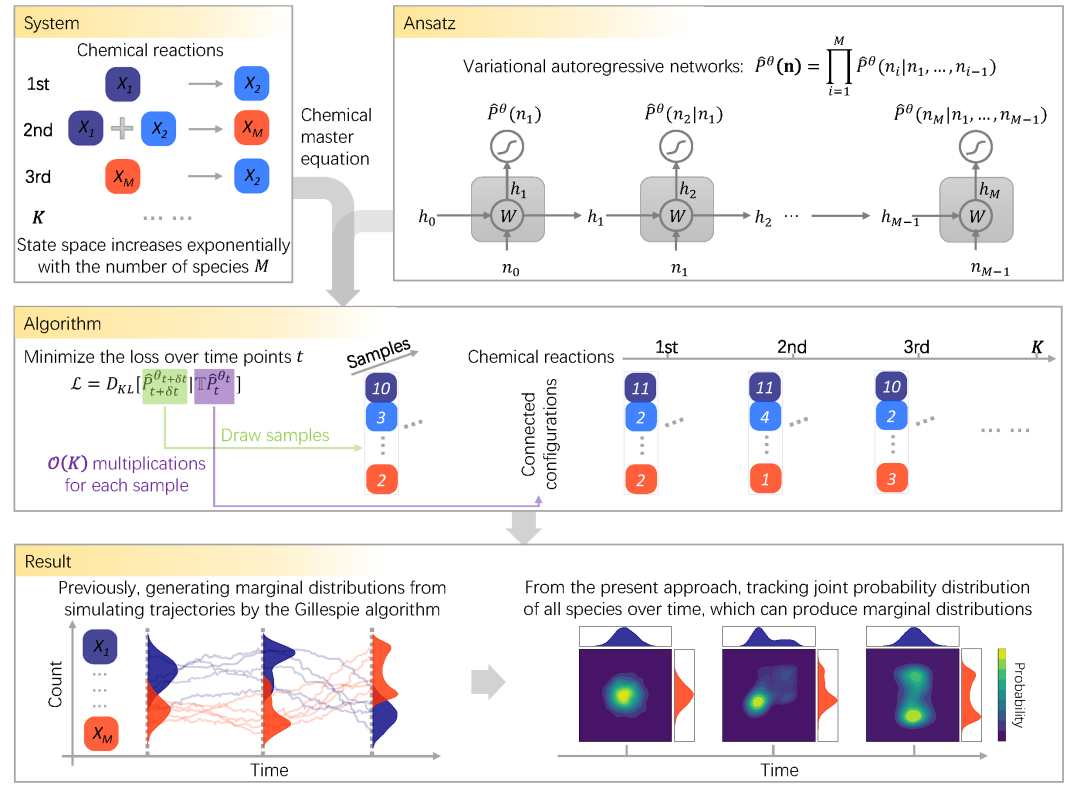 2023年3月16日,北京师范大学复杂系统国际科学中心的汤迎副研究员和学生翁佳钰、与中国科学院理论物理研究所的张潘研究员合作,在 Nature Machine Inttelligence 杂志发表论文“Neural-network solutions to stochastic reaction networks”,提出了使用变分自回归网络来求解化学主方程的机器学习方法。该方法能跟踪联合概率分布的时间演化,在多个物理学和生物学中的代表性例子中得到应用。