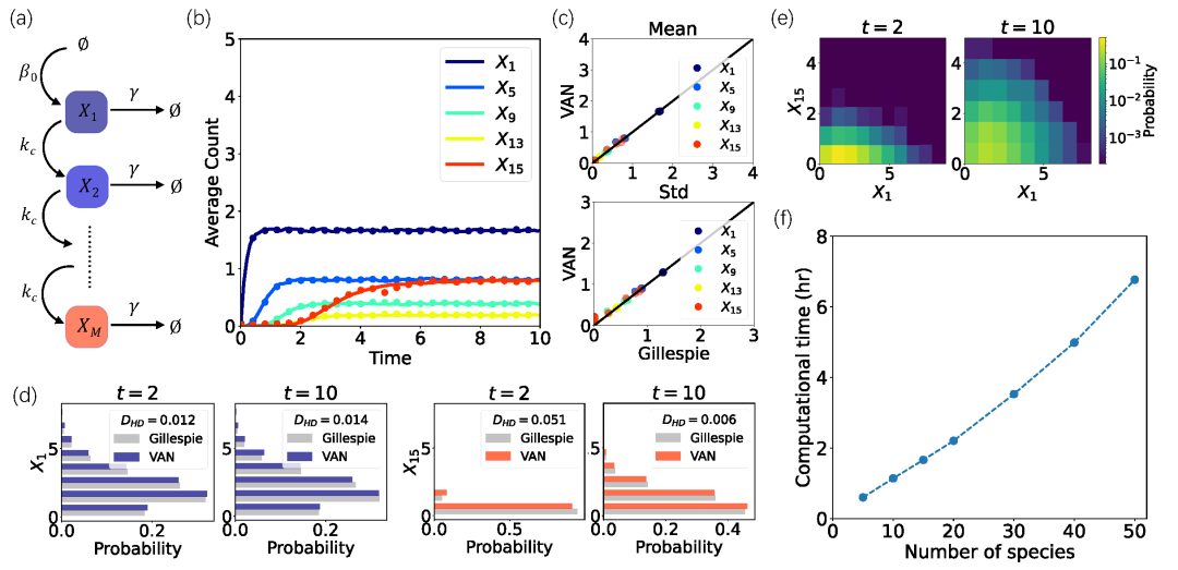 图3:细胞内信号级联反应的结果。(a)随机反应网络的示意图。(b)由VAN(点)和Gillespie算法(线)得到的基因和蛋白质的平均分子数随时间的演化。不同颜色表示不同物种种类。(c)在时间点t=1,2,…,10,VAN和Gillespie模拟之间物种分子数的平均值和标准差的比较。(d)Gillespie模拟(灰色)和VAN的边缘分布。图例中包含两个分布之间的Hellinger距离。(e)第一个物种和最后一个物种在VAN时间点t = 2,10的联合概率分布,颜色对应概率值。(f)物种种类数不同的系统的计算时间,可以发现计算时间尺度几乎与物种的种类数成线性关系,该方法对于高维系统有高效的计算效率。