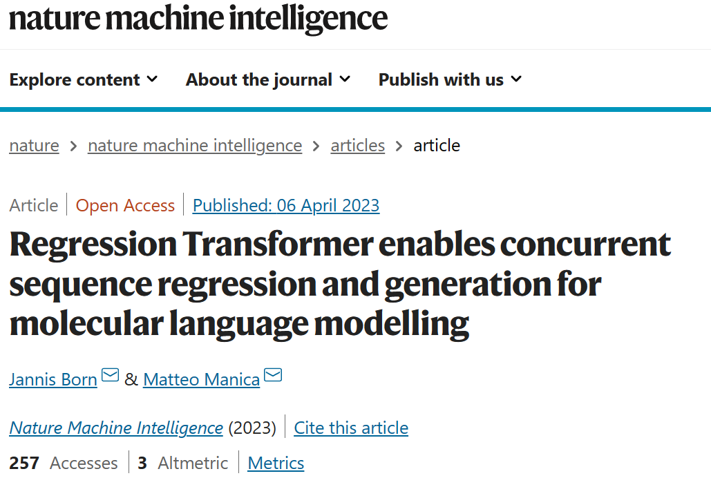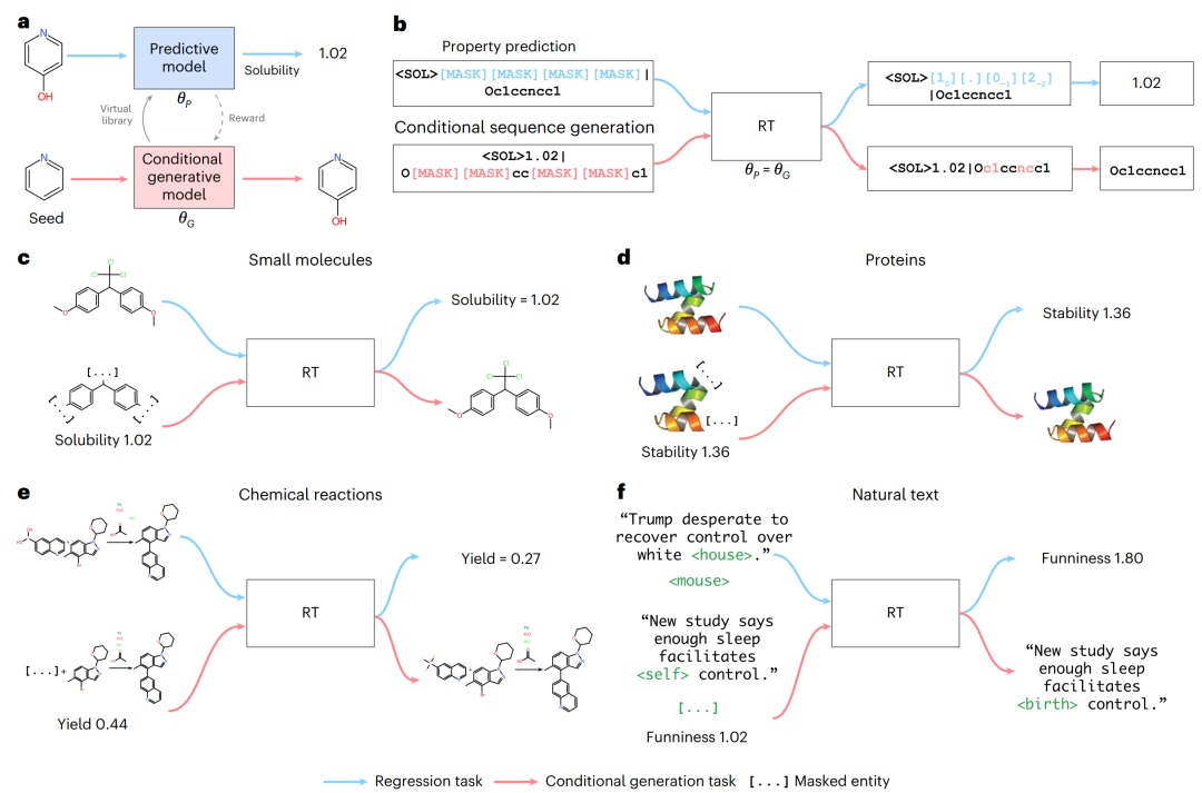 最近发表在 Nature Machine Intelligence 的这篇文章提出了一种将回归抽象为条件序列建模问题的方法,称为回归转换器(Regression Transformer,RT)。这是一种新型的多任务模型,可以在数字和文本标记的组合上进行训练,与 Transformer 中处理回归的规范方式不同。这为多任务语言模型引入了一个新的方向,无缝地桥接了序列回归和条件序列生成。他们证明,尽管使用标称尺度(nominal-scale)训练目标,Regression Transformer 在小分子、蛋白质和化学反应的性质预测中的效果,可能超过常规回归模型的性能。