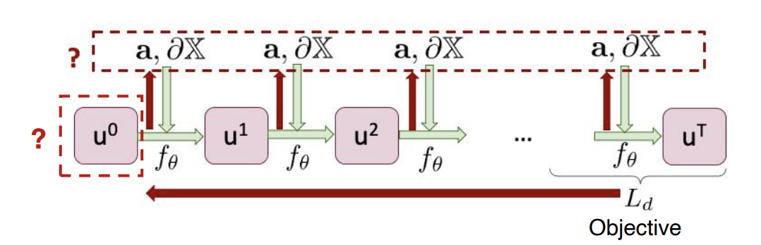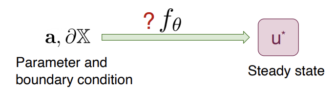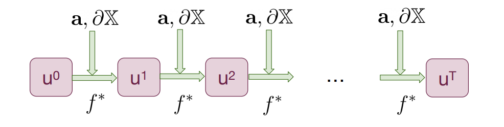 图2. 动力系统仿真示意图。μt是系统的初始状态,可以是一个连续函数,或者一个图;f*是演化动力学,可以是偏微分方程的演化,或者是真实世界的演化;a 是系统不随时间变化的静态参数;∂X是系统的边界条件。