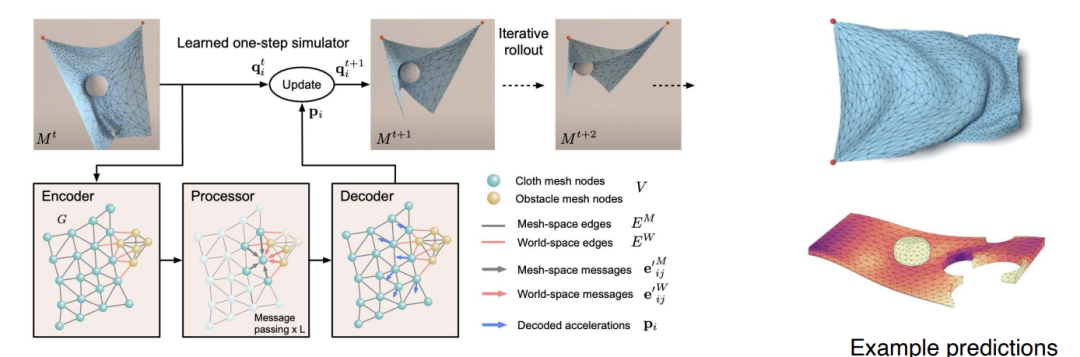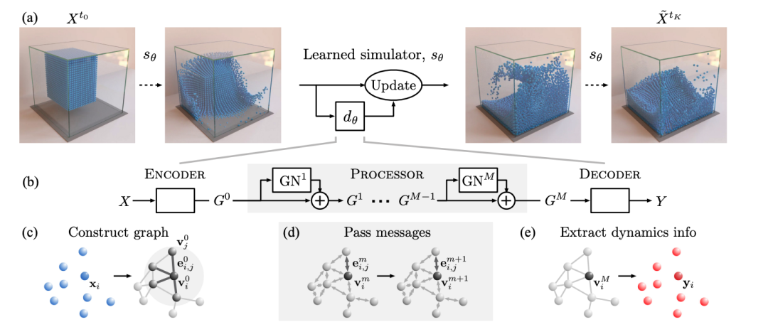 图3. 使用图神经网络模拟复杂系统。| 图片来源: Sanchez-Gonzalez et al. Learning to Simulate Complex Physics with Graph Network. ICML 2020. http://proceedings.mlr.press/v119/sanchez-gonzalez20a/sanchez-gonzalez20a.pdf