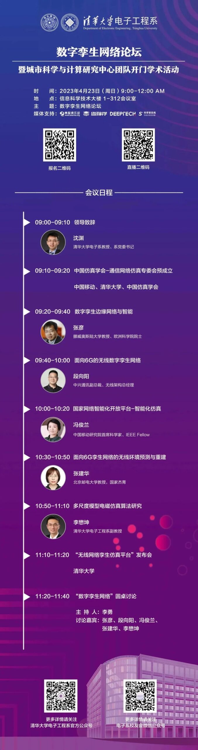 为多维度探索数字孪生技术在通信网络领域的应用,由中国仿真学会通信网络专委会主办,清华大学电子工程系、清华大学电子工程系城市科学与计算研究中心承办,多家科技前沿媒体支持的“数字孪生网络论坛”将于2023年4月23日上午举行。论坛届时将邀请全球顶尖专家学者、知名企业负责人进行主题分享,从学术前沿成果到产业应用场景,共同探讨网络通信行业数字孪生技术应用的前沿问题,推动相关技术的创新发展,促进相关领域的实践落地。