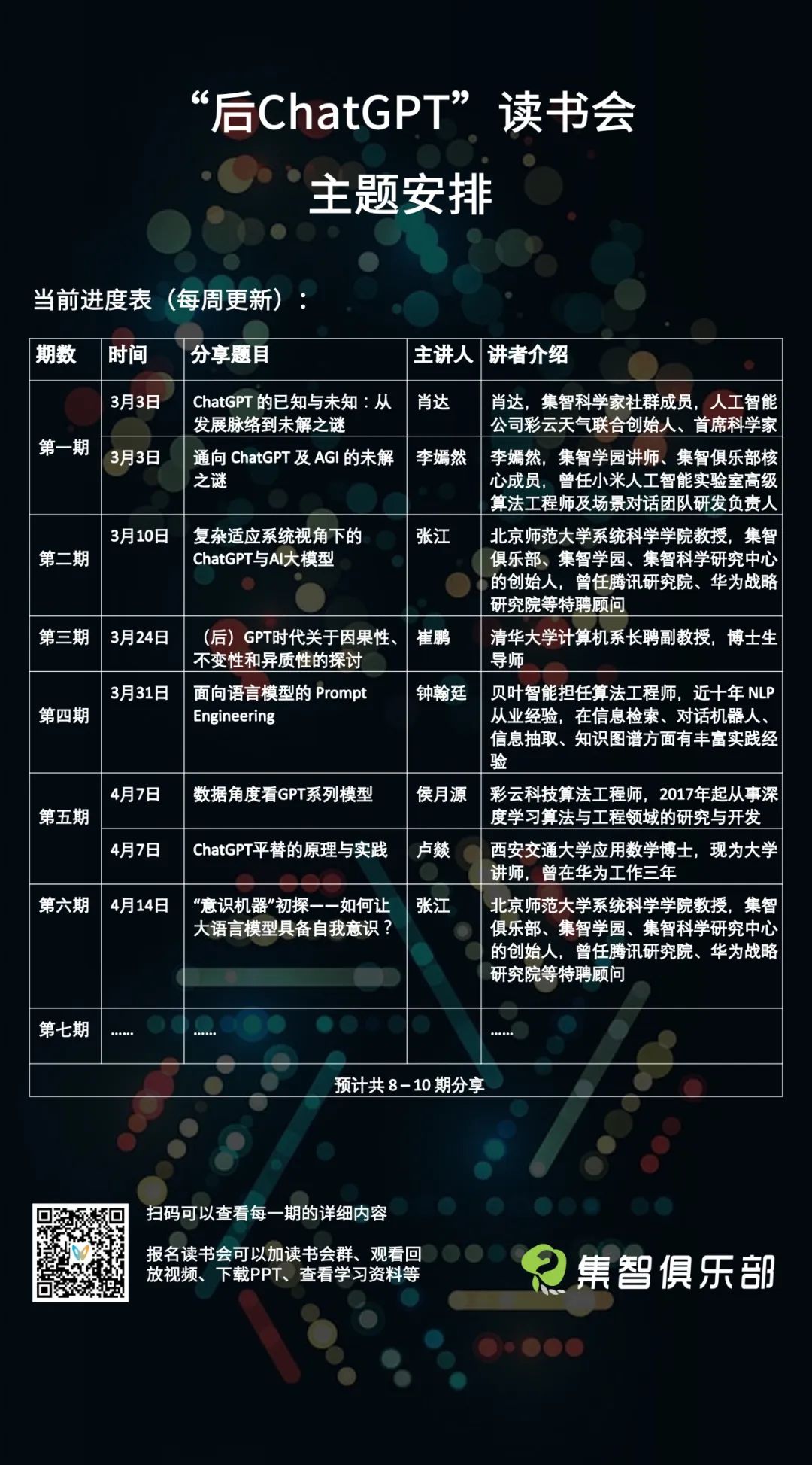 集智俱乐部的“后 ChatGPT”读书会由北师大教授、集智俱乐部创始人张江老师联合肖达、李嫣然、崔鹏、侯月源、钟翰廷、卢燚等多位老师共同发起,旨在系统性地梳理ChatGPT技术,并发现其弱点与短板。同时,结合集智俱乐部常年来积累的各种人工智能技术讨论,展望后GPT时代的人工智能都有哪些可能性?读书会自2023年3月3日开始,每周五晚上举办,持续时间预计6周,欢迎对本话题感兴趣的朋友报名参加!
