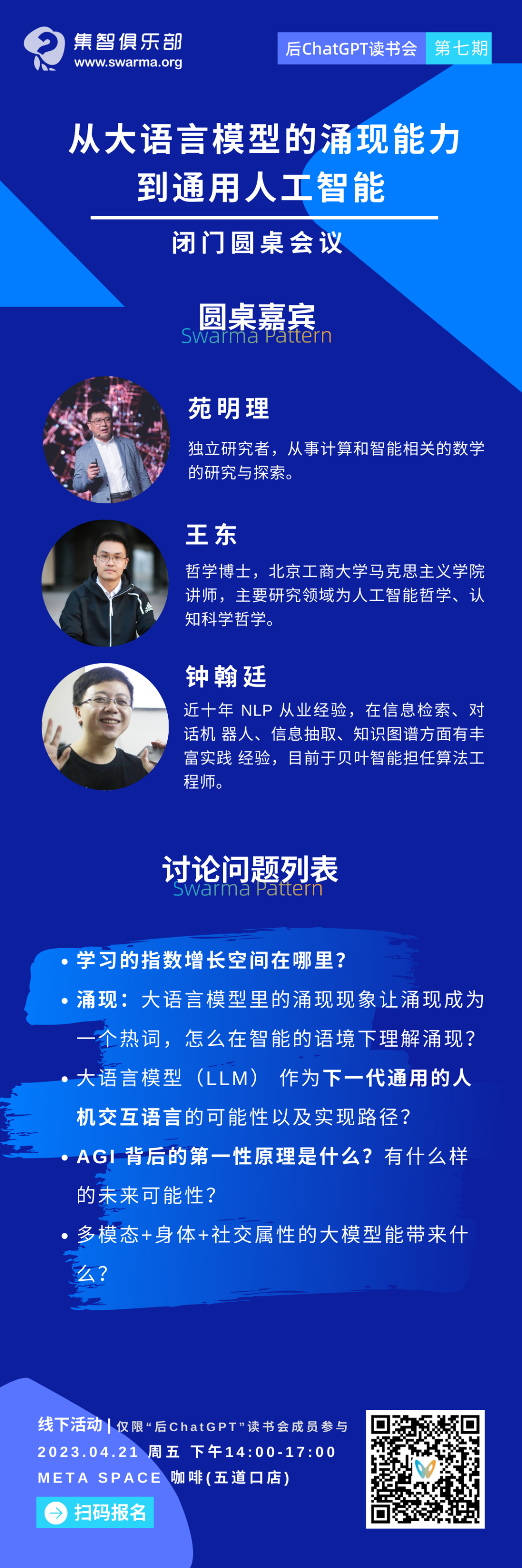 以ChatGPT为代表的大语言模型以其惊人的效果得到了广泛关注,不仅颠覆了许多行业的工作,随之而来也催生了一系列相关产品的诞生,同时也引发了许多对大语言模型的思考。在此背景下,集智俱乐部“后ChatGPT”读书会即将举行一次线下的闭门圆桌讨论。
