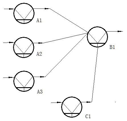 使用三元模拟神经元组成三元模拟神经网络(Ternary Neural Network)时,神经联结分为两种类型,一种是连接到下游神经元的数据端,另一种则是连接到下游神经元的控制端,如图3-8所示,图中A1、A2、A3为B1的数据输入神经元,而C1为B1的控制神经元。