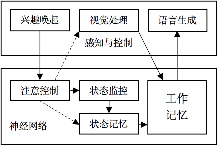 在图3-9所示的框架中,感知(视觉处理)、状态记忆、工作记忆三个模块带有记忆功能,可保持各自模块的信息直到刷新。兴趣唤起模块直接处理外部命令,当外部输入“look”命令时,兴趣唤起模块发出对应于视觉模块的控制信息。注意控制激活视觉模块,视觉信息被传输到工作记忆中加以保存,同时注意控制模块的状态(即对应于“看”的动作的神经状态)被状态监控模块传输给状态记忆模块保存。当外部输入“what”命令时,注意控制模块在兴趣唤起模块的控制下激活状态记忆模块,使其中保存的内容被传输到工作记忆中;与此同时,将这一运算周期内的注意状态(即对应于“自省”动作的神经状态)传输给状态记忆模块保存,而同时语言生成模块将当前工作记忆中保持的信息转换为语言符号并生成语音。