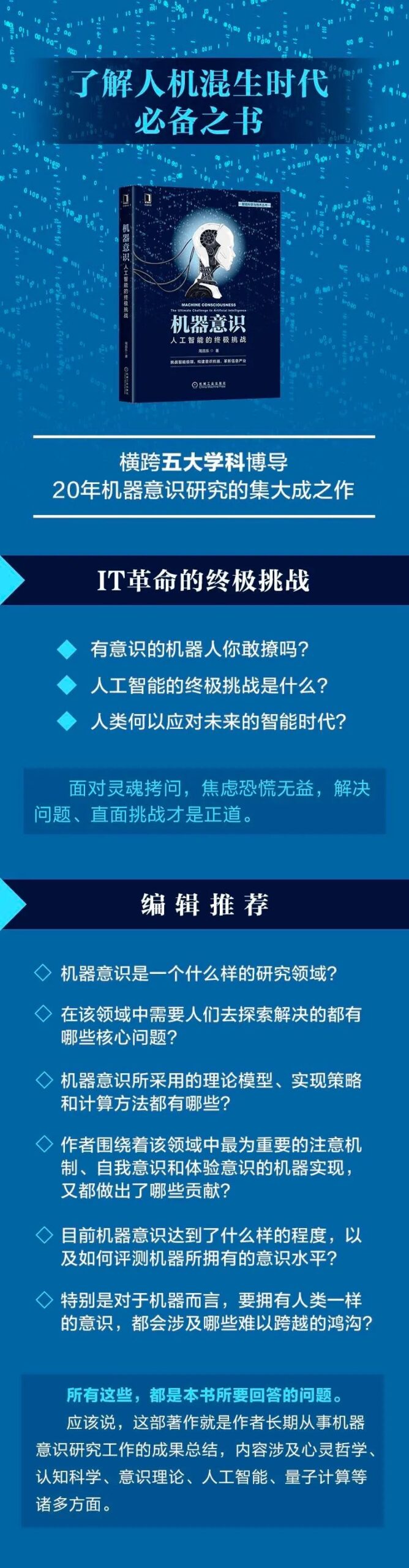 机器意识,未来人工智能领域的璀璨明珠,将成为人类信息技术革命的终极挑战。机器意识研究不但对深化人工智能的研究有着重要的推动作用,而且对科学地解释神秘的意识现象同样具有重要的推动作用。