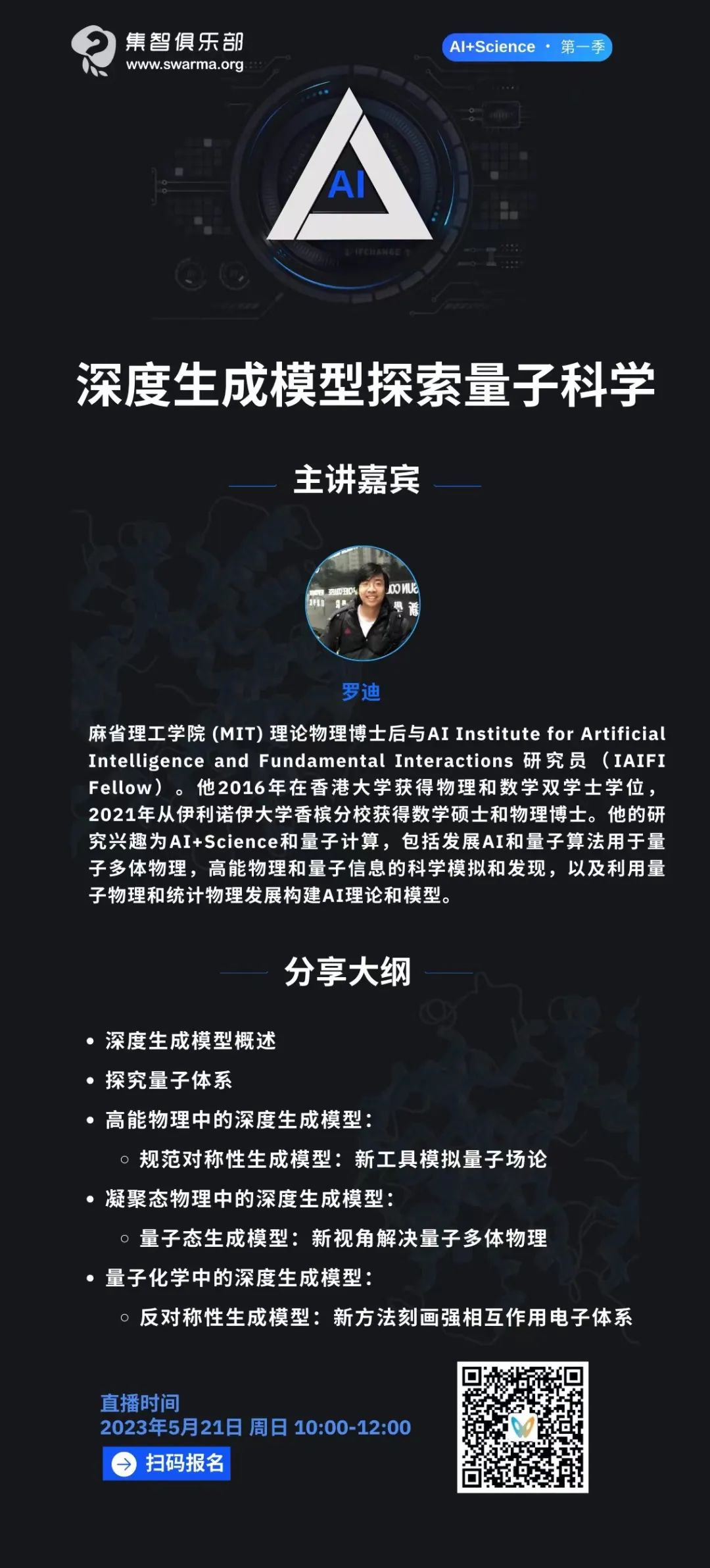 量子力学是描述微观世界规律的主要理论,具有极高的重要性,但同时也充满了挑战性。随着深度生成模型的发展,我们现在有了新的解决方案。本次分享将由麻省理工学院 (MIT) 理论物理博士后与AI Institute for Artificial Intelligence and Fundamental Interactions 研究员(IAIFI Fellow)罗迪老师来帮助大家从生成模型的角度来解决量子领域的问题。