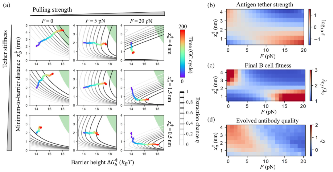 研究理论预测,一方面,抗原系链强度的物理限制在牵引力下设定了亲和力上限。另一方面,有趣的是,细胞可以利用力的异质性来使结合表型多样化,而不影响适应性,从而在资源限制下保持可塑性。