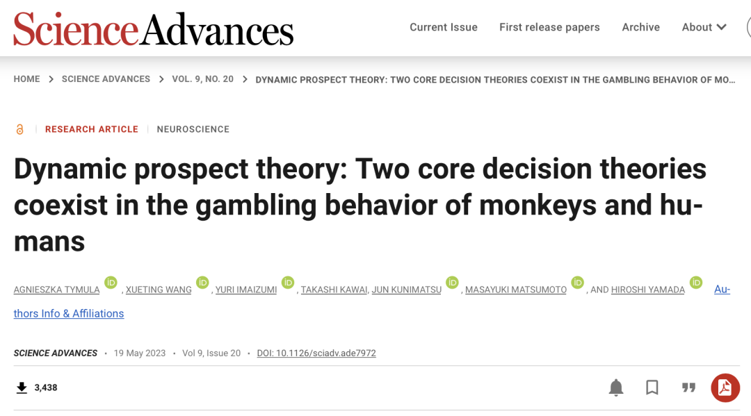论文题目:Dynamic prospect theory: Two core decision theories coexist in the gambling behavior of monkeys and humans