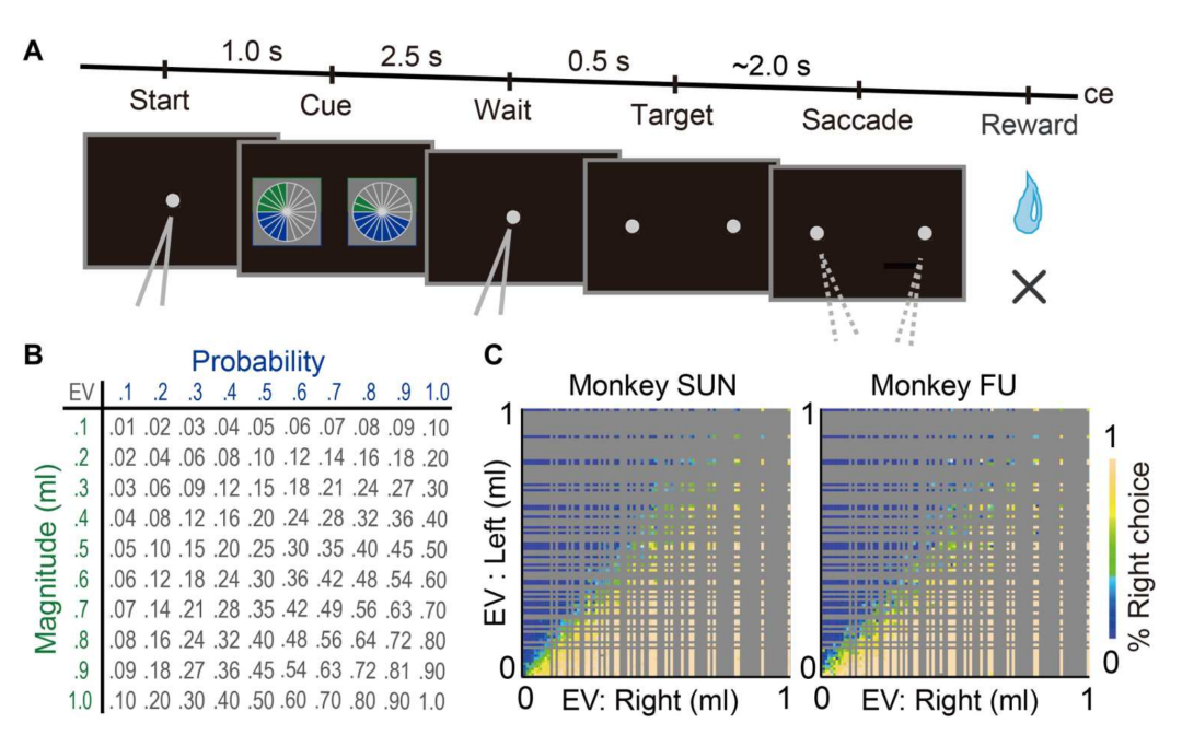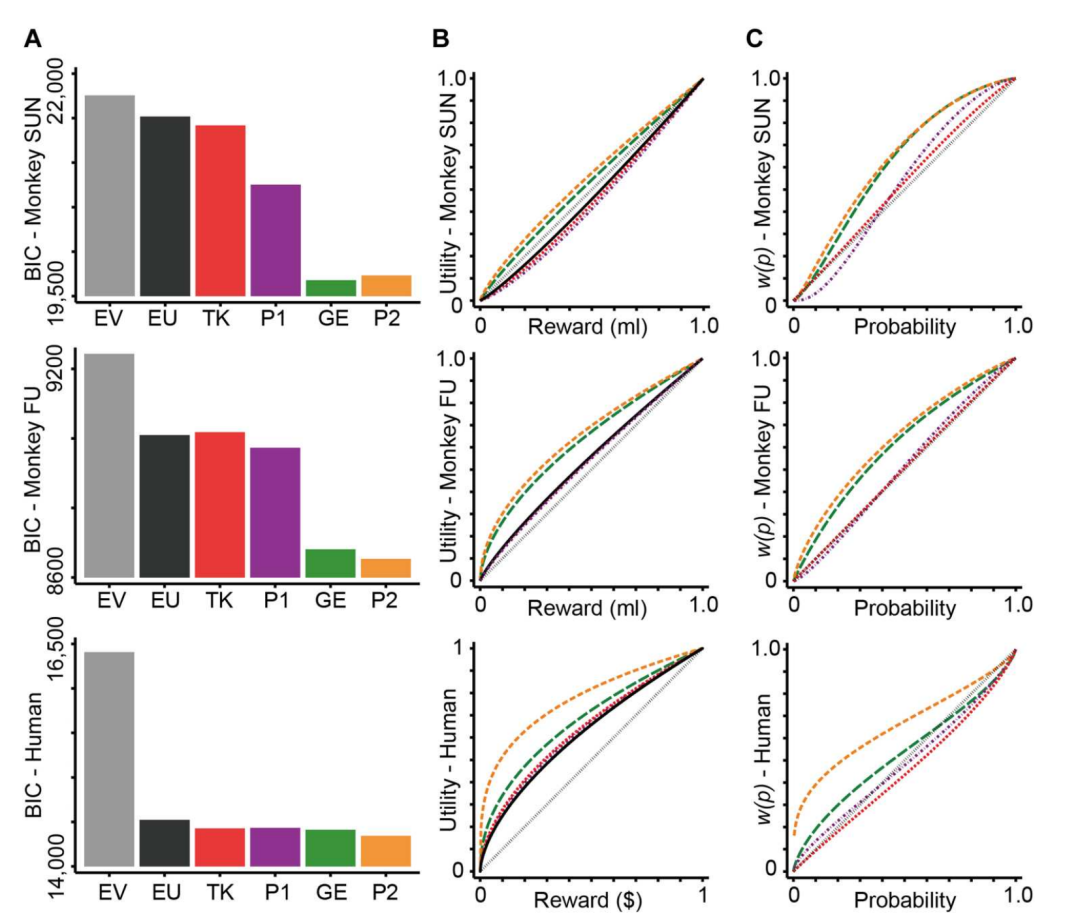 在这篇最近发表在 Science Advances 的文章中,作者假设这两种不同的理论以一种综合的方式指导决策。作者结合这些极具影响力的理论,提出并测试了一个不确定性下的决策理论——动态前景理论(Dynamic prospect theory)。通过让实验室猴子做赌博决策来测试模型,并揭示了实验数据与前景理论假设条件的系统性违背,即概率权重是静态的。采用相同的人类实验范式,对该模型的各种计量分析表明了人类和猴子之间大量的相似性。
