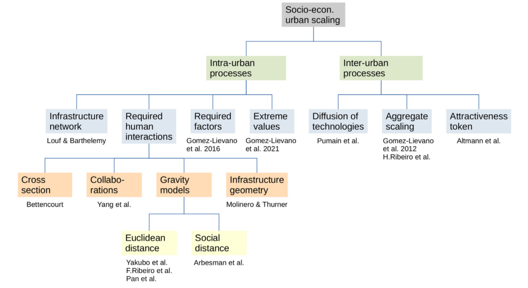 大多数城市内部模型认为城市标度的出现来自于人类的互动,即城市中有意或无意地与人相遇。例如,Bettencourt提出的模型采用了物理学中已知的横截面概念进行类比。在城市内部采用人类互动的模型是基于一个特定的互动概率。这促使我们将这种概念上的重叠统一到一个将这种概率正规化的框架中。事实上,这组模型只是在如何估计互动概率的推理上有区别。在回顾引力模型时,有三组作者独立地采用了不同的观点,导致了相同的结果(在给定的参数组合中)。物理学中对引力的类比有很长的历史,并在更广泛的背景下进行了研究。相应地,作为一个小的展望,进一步统一引力的应用将是有趣的。