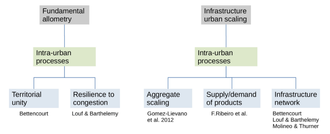 在过去的几年里大量的工作认为城市变量取决于人口规模N,而没有必要纳入其他变量或甚至来自邻近城市的信息。事实上,这背后的主要想法是,城市变量的结果只是城市内部过程的结果。然而,城市之间是不断互动的,城市指标对人口规模的依赖可能仅仅是一个成功的一阶近似表现。这一节使用城市的内生因素介绍了城市规模法则起源的数学模型,此处将城市内部的模型分为两类。第一类考虑了人与人之间的互动,以解释非线性的城市规模法则。第二类则认为当城市中存在一些必要的补充因素时,就会出现非线性的城市规模法则。