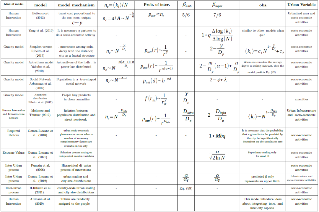 表1:解释城市非线性规模法则的模型的主要特征