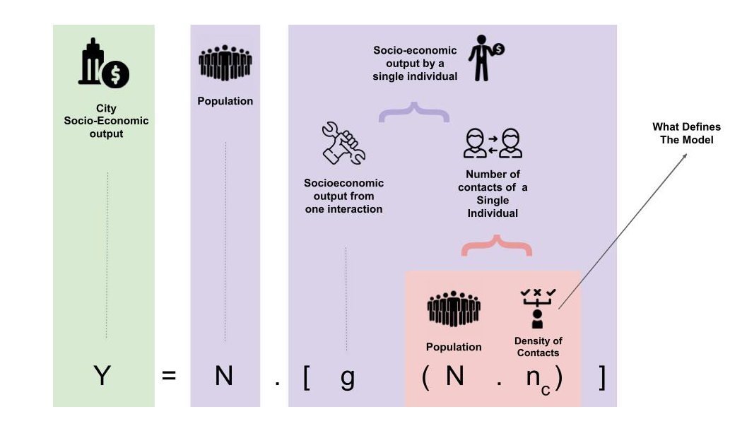 下面介绍的模型的不同之处在于,它们是如何计算个人的平均接触密度(nc)的,从而计算出这些接触产生的社会经济财富。所考虑的模型基本上服从于以下描述,特定社会经济变量的总结果Y可以理解为该城市所有个体社会经济产出的总和,即Y = Ny。反过来,个体的社会经济生产y是由单一互动(g)产生的社会经济产出乘以每个个体的互动总数(ki)的结果,从而产生了Y = gN ki = gN2nc的关系。