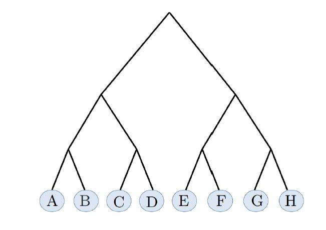 图6:树形社会网络。由N=8个个体组成,分别命名为A、B、…、H,分布在N个叶子中。在这种情况下,所有的分支都分裂成b=2个其他分支,这个网络中任何两个个体之间的距离d是他们最低共同祖先的高度。例如,A和B(AB)之间的距离是d=1;AC和AD是d=2;AE、AF、AG和AH是d=3。