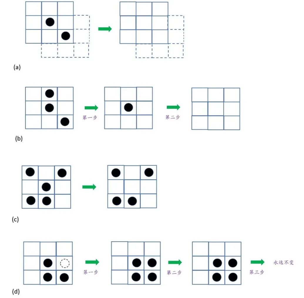 明白了这几条简单规则之后,你就可以开始玩这个游戏了。当然你会有个感觉,开始的时候放入多少个黑子以及怎样放置它们,这对于游戏如何一步一步地发展下去会有决定性的影响。例如,图1(d)中四个黑子处于稳定状态,它们永远都不会死去,也就是会“长生不老”永不消失,而其它初始放置方式(图1(a)、(b)、(c))则会让黑子在若干步之内全部死光。