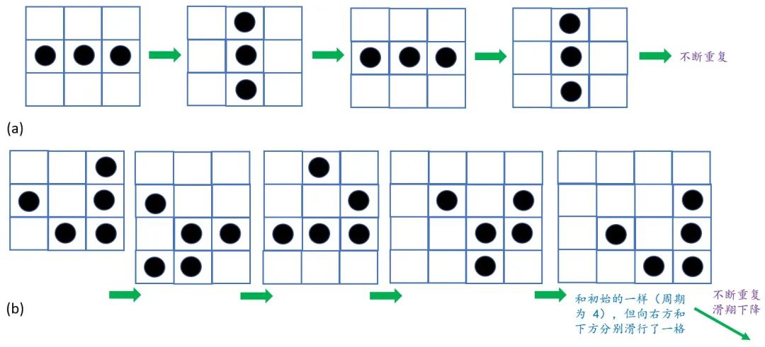 你这个感觉是对的:游戏的初始条件(即放入多少个黑子以及怎样放置它们)的确很重要,它们会生成各式各样、丰富多彩的黑子组合斑图以及许多不同的最终结果。例如,图1(d) 就生成永远不变的斑图,称为“静物”(still life)。图2(a) 则生成周期-2的“振荡”(oscillator),而图2(b) 却生成一种会移动的周期“宇航船”(spaceship)。这种情形特别有趣,它在一步一步演变的过程中,初始的5个黑子不会减少也不会增多,但会频繁改变位置,像一艘不断变形的宇航船一直往右方和下方移动。第四步时,它变回初始状态了,不过整个斑图的位置向右方和下方各移动了一格。之后,它继续往前走,斑图的变化不断重复前面的移动过程。这是一艘会移动的周期-4振荡宇航船,称为“滑翔机”(glider),它将永远不停地向右下方滑翔前进。