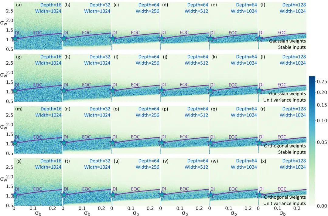 图3. 原论文中的实验数据图一。展现在不同深度、宽度和初始化参数下有限神经网络中输入输出互信息的值。从图中可看出临界线(EOC)附近的互信息较大,进一步精细计算可得最大值点在动力等距点(DI)附近。