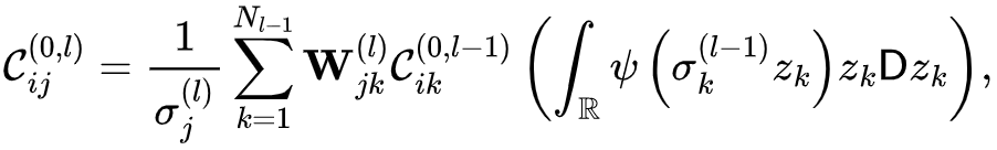为了能使用数学工具从理论角度研究神经网络的初始化问题和其中的信号传递,平均场近似的思想被引入到神经网络的处理中并被证明有效 [10,11]。平均场近似的研究对象是具有相同参数分布的无限宽神经网络所构成的神经网络系综,在神经网络中间层宽度趋向于无穷的极限之下,通过中心极限定理可以认为神经网络的权重W与偏置ε的系综分布都是高斯分布,在信号传播的积分式中直接将网络参数作为相应的高斯随机变量代入即可。