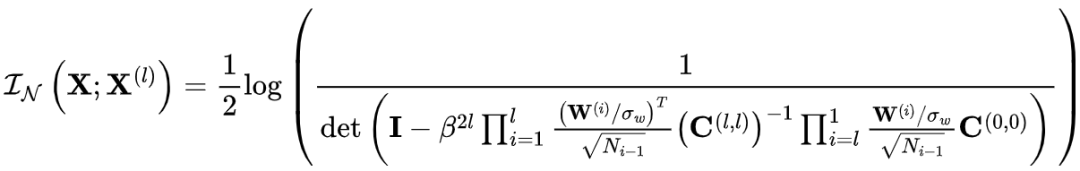 抛弃独立同分布假设后,为了能从解析的角度有所分析,作者提出计算输入输出互信息的下界。经由高斯信息瓶颈理论[12,13],作者将研究的对象转向具有联合高斯分布的输入信号。此时无论输出信号的分布,均可以采用高斯互信息作为真实互信息的下界[14],计算出的下界值是: