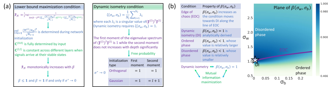 图2.原论文中的证明逻辑诠释图。(a)β最大值点和动力等距点都是σ*→0的点。(b)β在无限宽神经网络系综相图上的性质以及数值计算结果,其中在动力等距点上最大化。