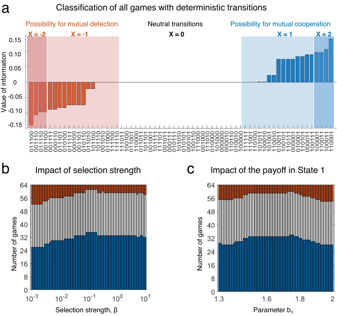 进一步,作者考虑在弱选择的极限情况下64个随机博弈,发现:1)信息受益博弈和无知受益博弈的数量一样多;2)在21个博弈中,有信息和无信息时的合作率是相同的,这些博弈是中性的,要么是因为存在吸收状态,要么是因为过渡与状态无关;3)在其余的博弈中,绝大多数博弈都能从信息中获益。