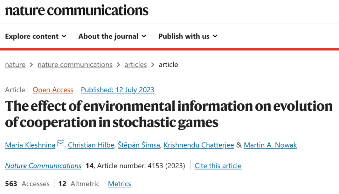 合作可以概念化为一种为他人创造利益的个体高成本行为,人类通常通过直接互惠来支持合作,他们会优先帮助曾经帮助过自己的人。为了规范地描述直接互惠,传统的合作模型考虑了重复面对相同策略博弈的个体,然而这些模型假定互动发生在一个恒定的社会和自然环境中,一轮博弈中的个人行为不会影响未来的具体博弈,与此相反,在许多应用中,环境是自适应的,此类应用最好用行为与环境之间存在反馈的模型来描述。