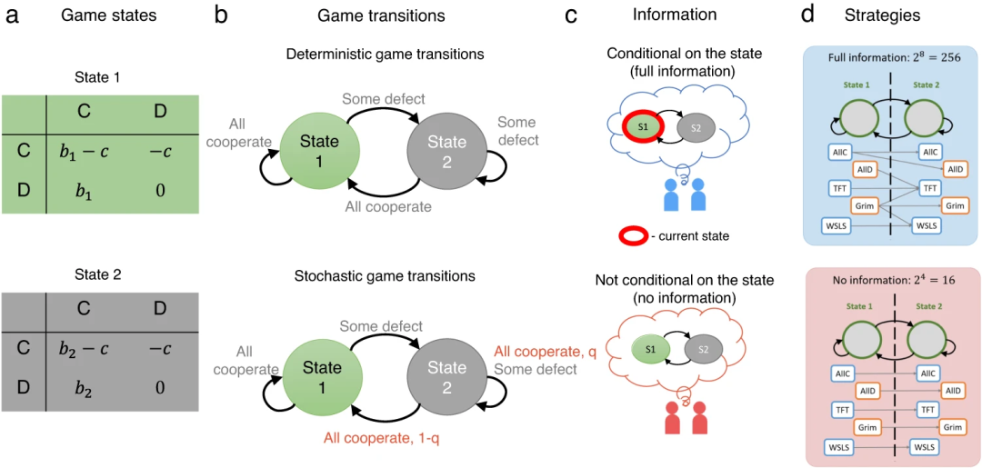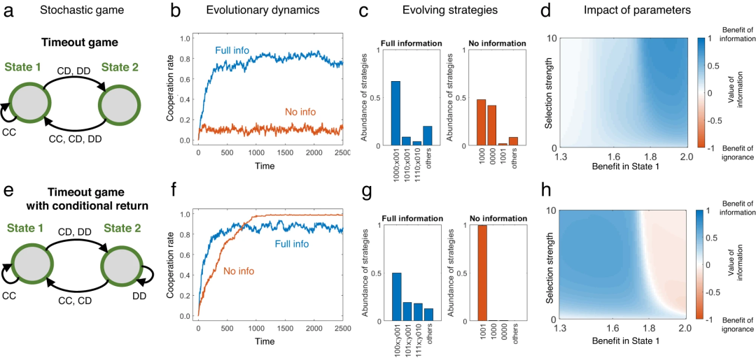 第一种情况是个体能够了解环境状态并根据当前状态做出决策的情况,这种情况称被为“全信息环境”(full-information setting);第二种情况是个体可能意识到他们正在进行随机博弈,但他们忽略或无法获得有关当前状态的信息,因此他们的决策与环境无关。这种情况被称为“无信息环境”(no-information setting)。结果表明信息的影响并不小,三种情况都可能发生:状态信息对合作有利、中性或有害。