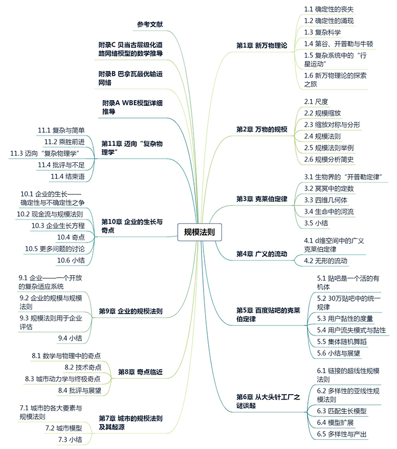 规模法则揭示出事物复杂性表面下微妙的隐藏秩序。它们可以帮助我们理解各式各样的系统是如何发挥功能、逐步演化,以及与其他系统发生相互作用的,还能够回答一台机器、一家公司或一个生命体的效率如何,以及怎样规划一座城市,让它实现可持续发展。同等重要的是,它们还能指出那些分发能量、资源和信息的各式各样的复杂网络在系统中的重要作用。例如,规模法则能够揭示出树、河流网络、血管网络等网络的分叉模式有哪些相似之处和不同之处,这些特征如何与一家公司的社会网络动力学相联系,以及不同社会中个体的行为有哪些普适性的规律。