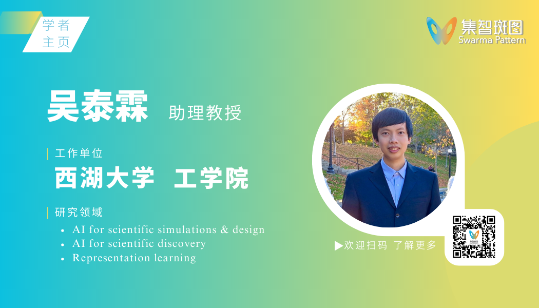 吴泰霖博士为西湖大学工学院人工智能方向助理教授。吴泰霖研究方向为 AI 与 Science 学科交叉的核心、普适问题,包括:(1)开发机器学习方法用于大规模科学仿真和设计(流体、机械、材料、生命科学),(2)开发机器学习方法用于科学发现(物理、生命科学),(3)基于图神经网络和信息论的表示学习。吴泰霖的工作正被用于流体、等离子体、材料等的大规模仿真,以及物理、天文等领域的科学发现中。其工作发表在 NeurIPS、ICLR、UAI 等机器学习顶级会议以及物理学顶级期刊上,并被 MIT Technology Review 等报道。他也是美国国家科学院院刊(PNAS)、Nature Communications、Nature Machine Intelligence、Science Advances 等综合期刊,以及各机器学习顶级会议的审稿人。博士后期间指导的学生也进入到 Stanford、MIT、UC Berkeley 等学校计算机系或统计系攻读博士学位。