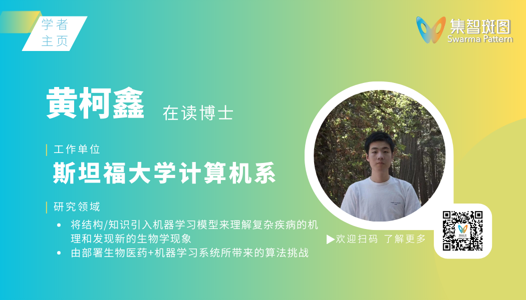 黄柯鑫目前就读于斯坦福大学计算机系二年级,导师为Jure Leskovec教授。研究兴趣是将结构/知识引入机器学习模型来理解复杂疾病的机理和发现新的生物学现象。同时也研究由部署生物医药+机器学习系统所带来的算法挑战,比如统计保证,低数据泛化以及可解释性等。