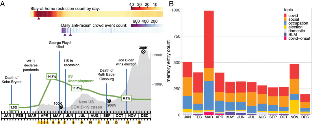 图1 A)2020年美国重大事件的时间线。B)每月自传式记忆中不同事件主题占比。