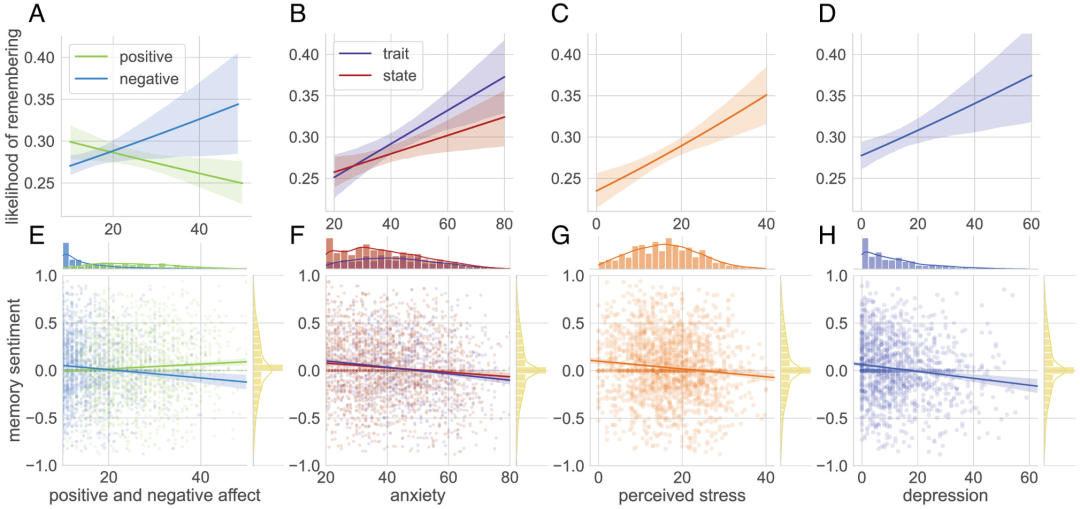 图3结果表明:1)负面影响增加了检索到那个月回忆的可能性(A-D);2)经历过的情绪会影响回忆那段记忆时的情绪(E-F)。