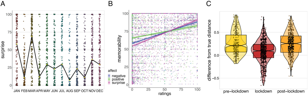 图5结果表明:1)对流行病新闻的集体记忆更加强烈、令人惊讶和消极(A);2)记住的惊喜、积极情绪和消极情绪的程度,各自独立地与更大更难忘的事件的记忆力相关(B);3)封城使得我们记忆中两事件相隔时间缩短了(C)。