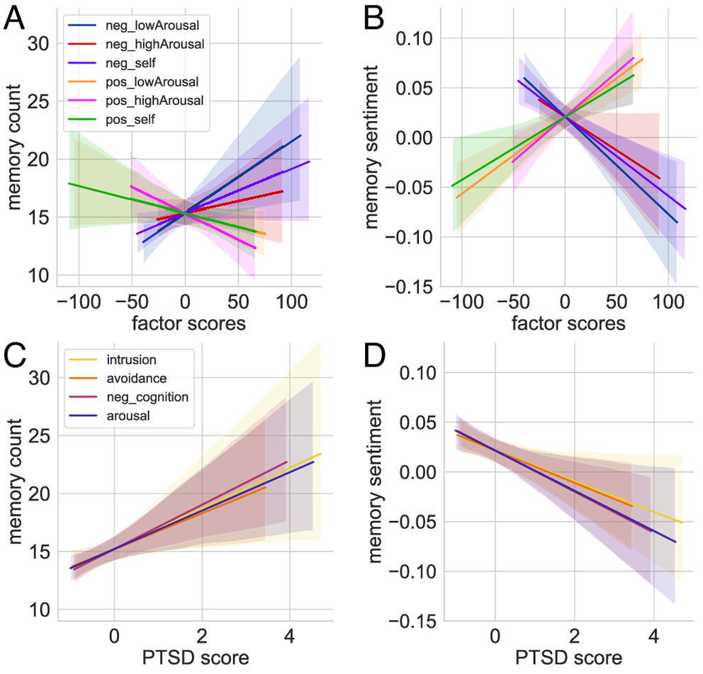图4结果表明:1)六个因素预测回忆的数量和情绪(A-B)。2)创伤后应激障碍(PTSD)预示着越来越多的负面记忆,尤其是非情节细节(C-D)。