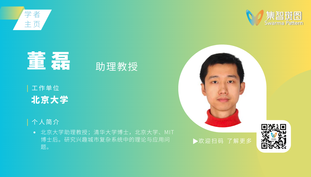 董磊,北京大学助理教授;清华大学博士。研究兴趣: 城市复杂系统中的理论与应用问题。具有建筑学、经济学、城市研究等多个领域的学习和研究背景,曾在百度研究院Big Data Lab (BDL),从事时空数据挖掘工作。