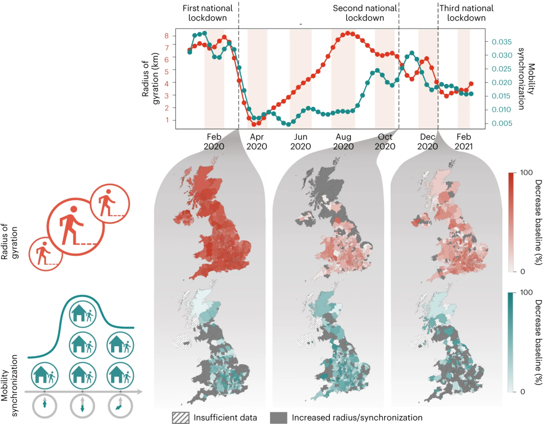 图1 自2020年第二周到2021年第7周,英国三次全国封锁前后人群生活半径和移动时间同步性的演变。
