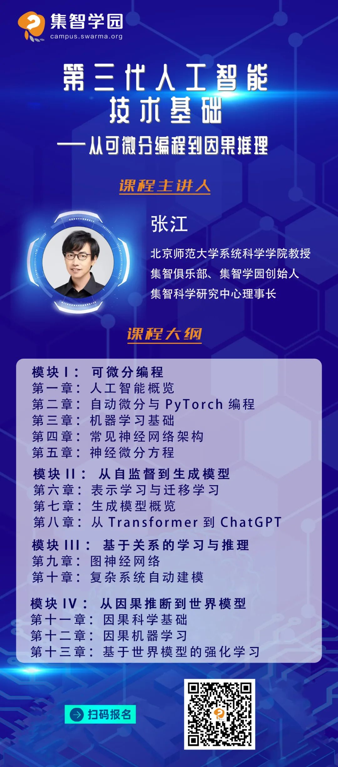 这门课程系统化地梳理了从机器学习到大语言模型、从图神经网络到因果推理等一系列可能成为第三代人工智能基础的技术要素,编写了4大模块课程,方便初学者通过模块化的学习,快速建立起理论和技术的基础。