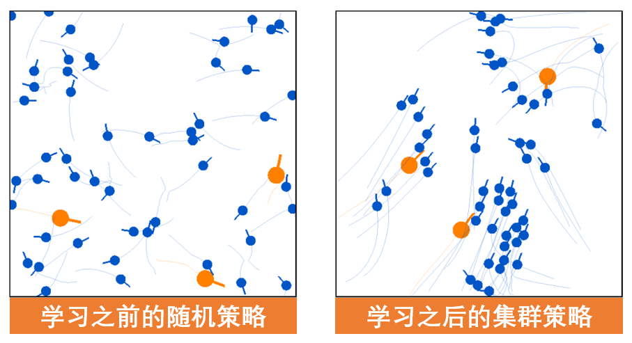 通过使用上述框架,我们观察到了集群行为的涌现。左图显示了协同进化之前的一个典型情景:我们可以看到,猎物在各个方向上随机移动。右图则显示了进化之后的典型情景:可以看到,猎物形成多个群体,并展现出协同运动模式和高度同向性。