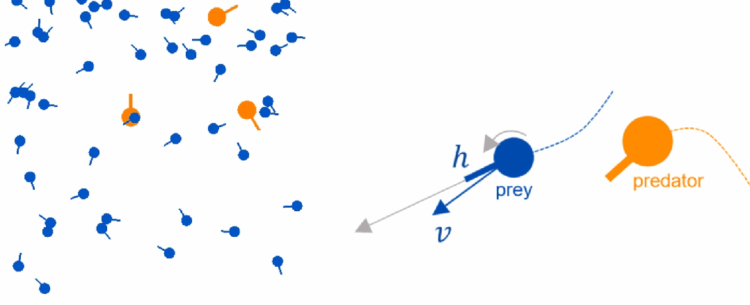 在我们的研究中,首先我们创建了一个仿真环境,用来模拟捕食者和猎物之间的互动。在这个环境中,橙色代表捕食者,蓝色代表猎物。这些智能体可以前进并改变方向,且具有碰撞动力学。